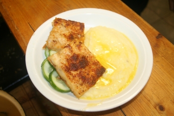 Oběd – čočková polévka a poté kuřecí řízek s brambůrkem, okurkový salátek
